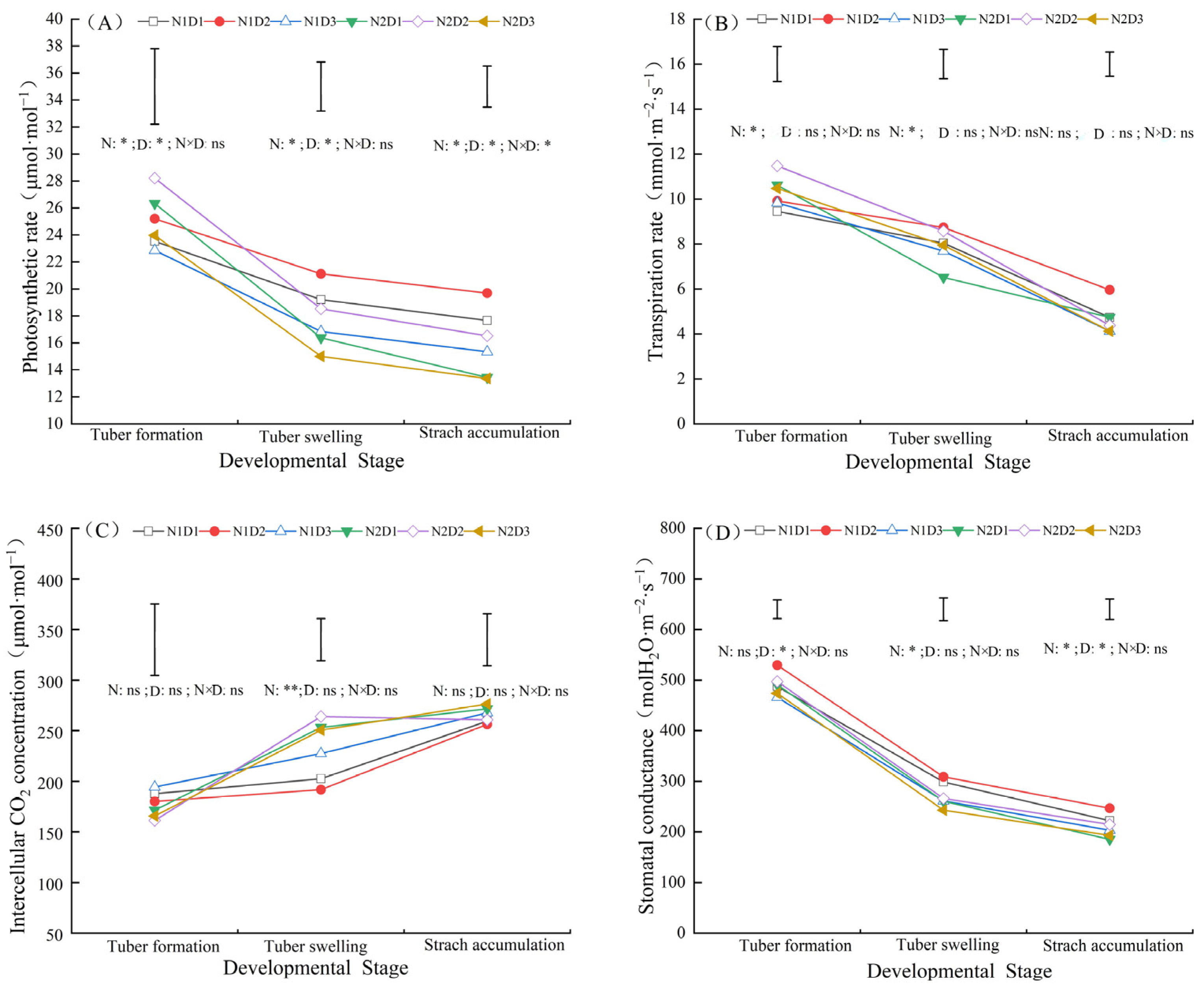 3.1. Changes in Photosynthetic Parameters and Photosynthetic Enzyme Activities in Potato Leaves Under the Interaction of Nitrogen and Density