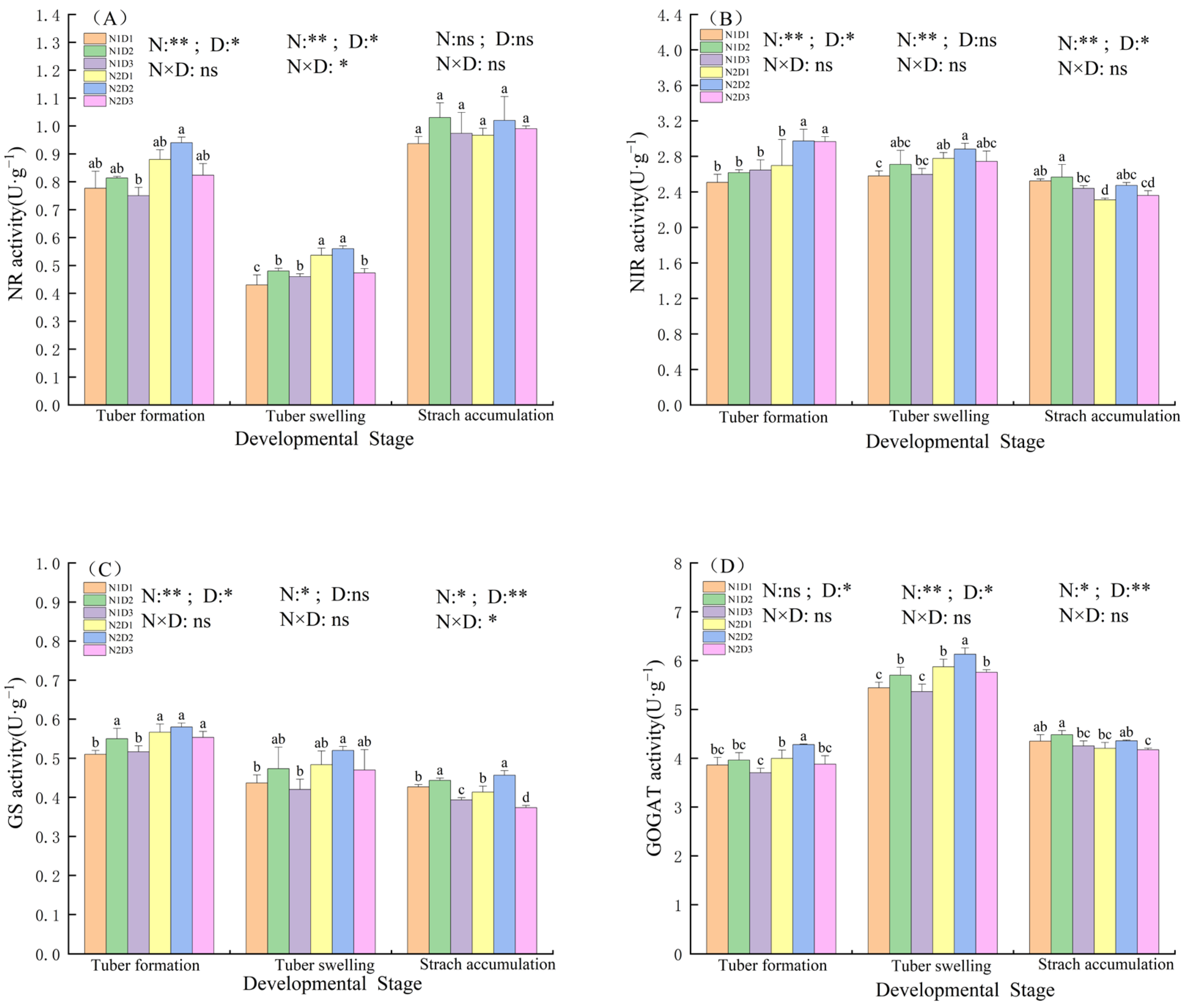 3.2. Changes in Nitrogen Metabolism Enzymes Activities in Potato Leaves Under the Interaction of Nitrogen and Density