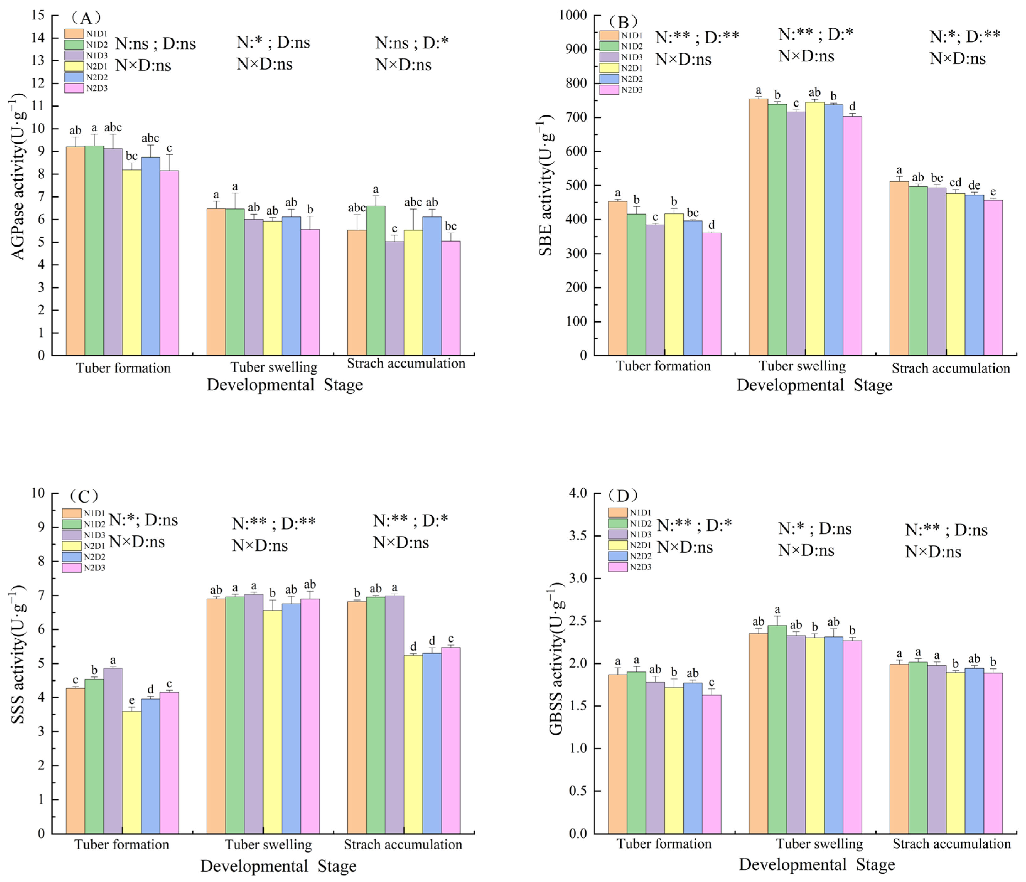3.3. Changes in Starch Synthase Enzymes Activities in Potato Leaves Under the Interaction of Nitrogen and Density