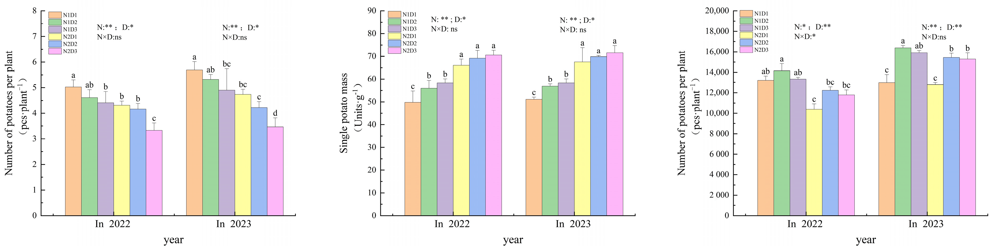 3.4. Potato Yield and Yield Components Under the Interaction of Nitrogen and Density