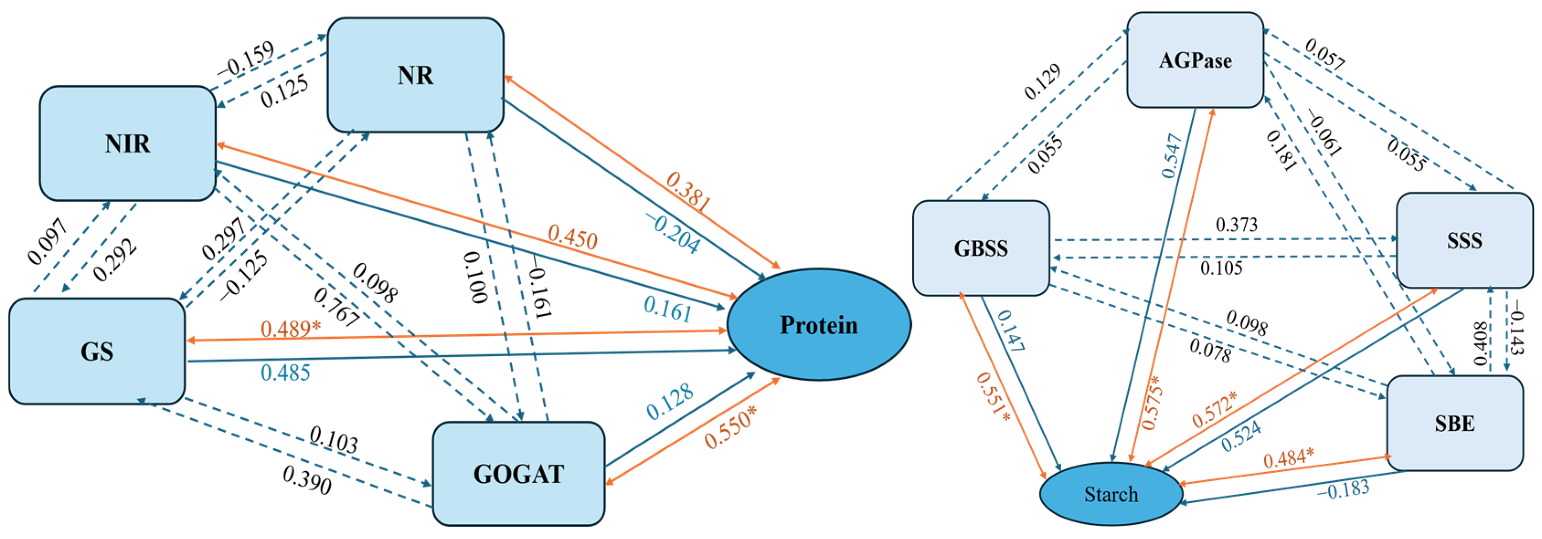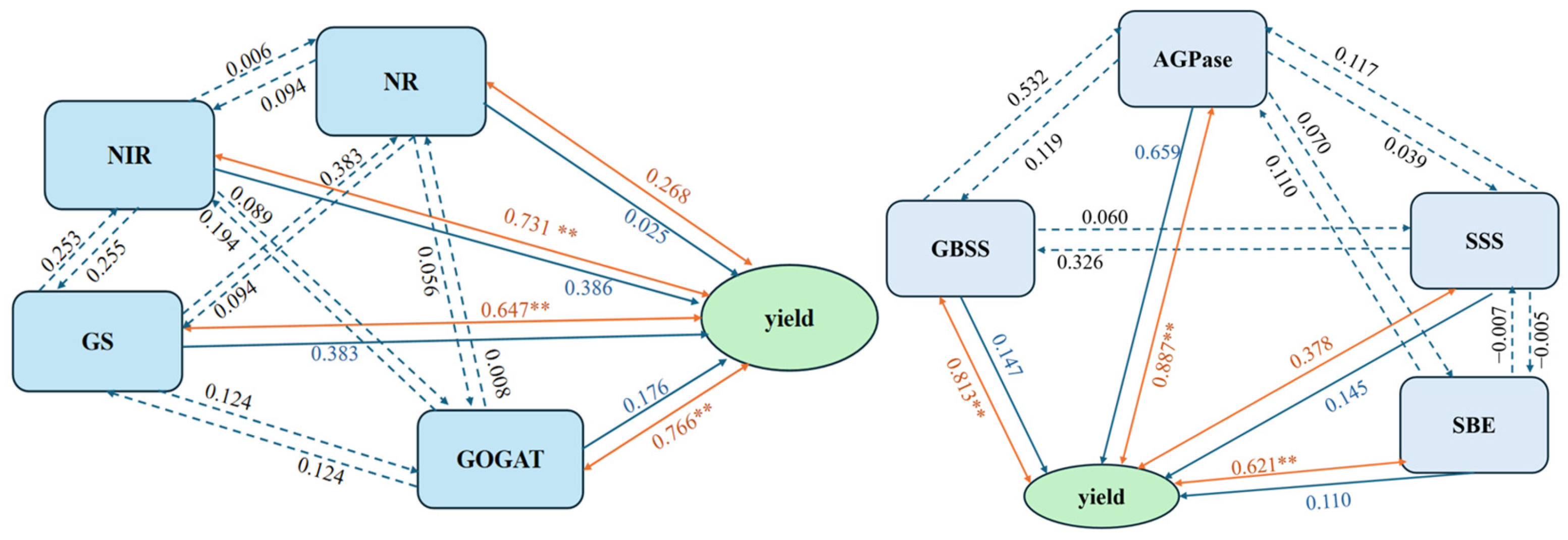 3.8. Correlation and Partial Least Squares Regression (PLS) Analysis of Nitrogen Metabolism, Starch Synthase Enzymes Activities, and Potato Tuber Quality Under the Interaction of Nitrogen and Density