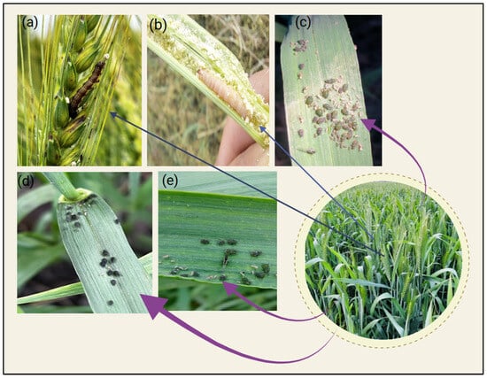 Wheat (Triticum aestivum L.), an esteemed member of the grass family Poaceae, is a vital staple food crop for majority of the world’s population [1]. Globally, 798.98 million tons of wheat were harvested in 2023 from approximately 220.4 million hectares (Mha) of land, making wheat the top-ranked grain crop by cultivated area during 2023 [2]. This cereal crop contributes about 20% of the total dietary calories and proteins worldwide [3,4]. Wheat is cultivated across a wide range of latitudes, with China, India, U.S.A., Russia, France, Canada, Australia, Germany, Pakistan, and Ukraine being the top ten wheat-producing countries [2]. However, wheat productivity is primarily constrained by a plethora of biotic and abiotic stressors [5]. Among biotic stressors, insect pests and diseases are the main limiting factors for wheat production, causing significant quantitative and qualitative losses [6]. Of the 10,000 documented insect species that damage crops used by humans for food [7], about 100 are harmful to wheat [8].