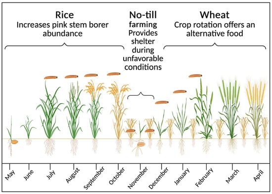 Incidence and seasonal dynamics of pink stem borer (Sesamia inferens) in rice–wheat crop rotation under no-tillage agricultural practices in North India (months shown in parentheses). First, rice crops concentrate pink stem borers, and their larvae feed on rice during the summer months (July–October). Second, after harvesting, pink stem borer larvae hide under rice stubble in wheat crop fields sown under no-tillage conditions (October–November) and later begin feeding on wheat plants (December until mid-February).