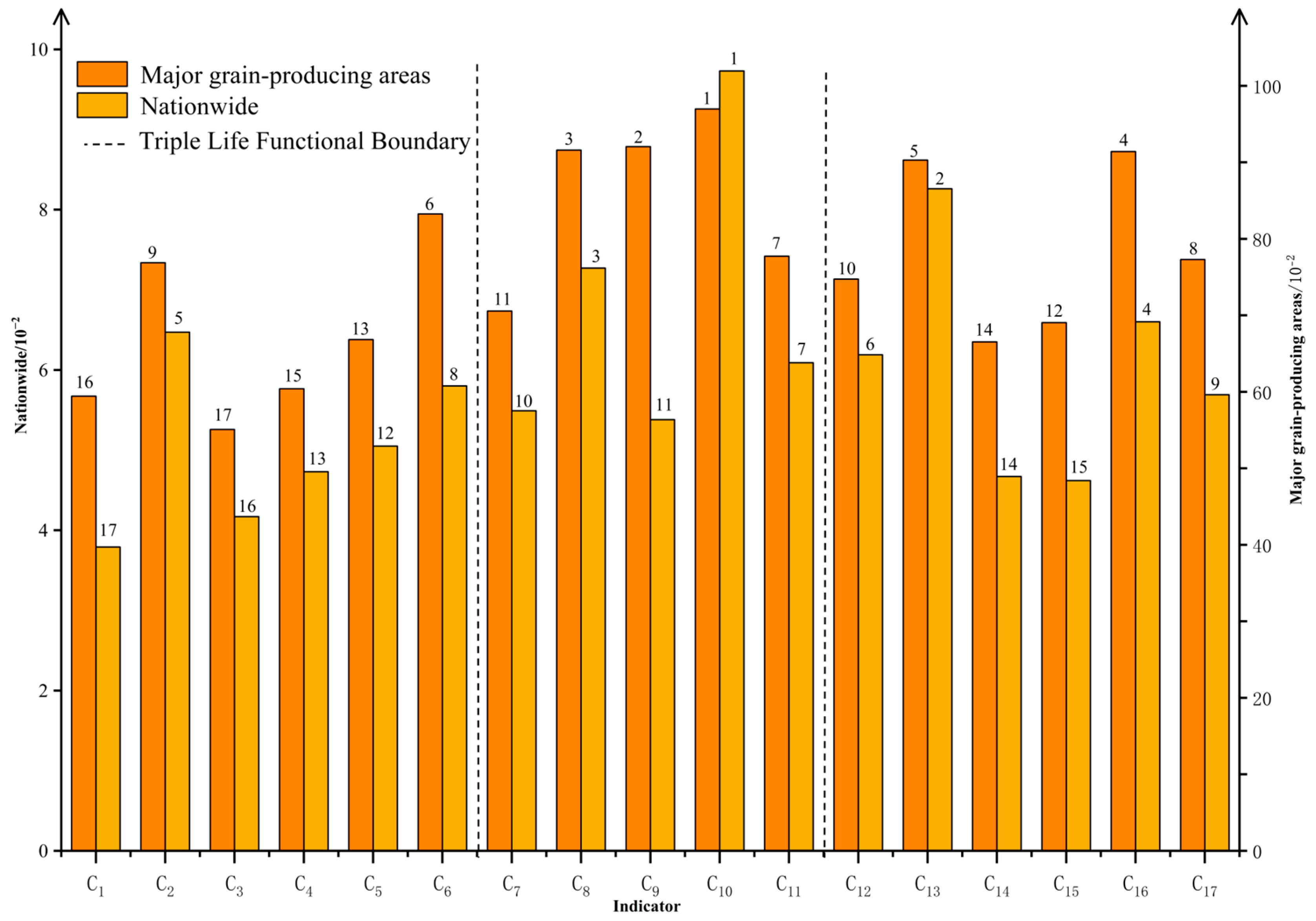 Water consumption per unit of grain production C5 | >50 | 35–50 | 30–35 | 20–30 | <20 | ||