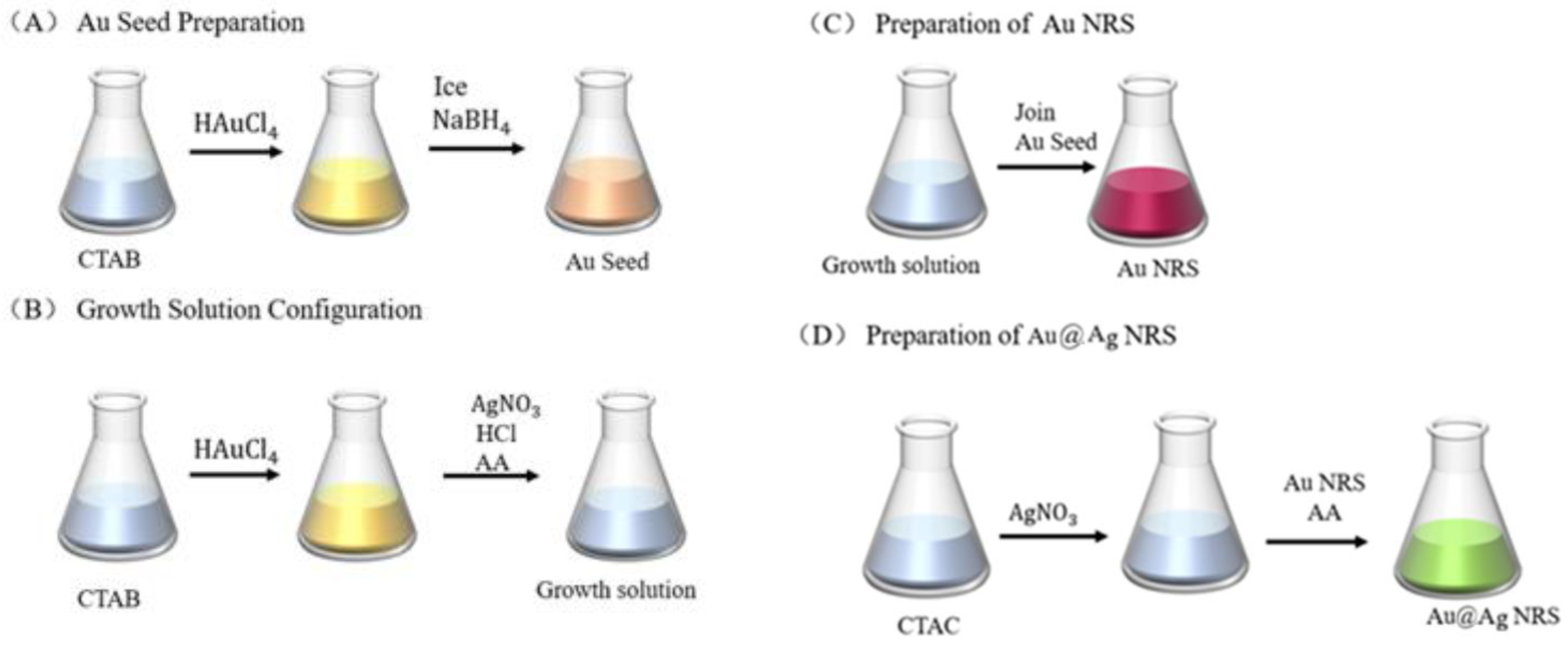 Au NRS (Gold Nanorods) was prepared through an experimentally modified seed-mediated growth method [21,22,23]. The synthesis of Au NRS involves two steps, as shown in Figure 1.