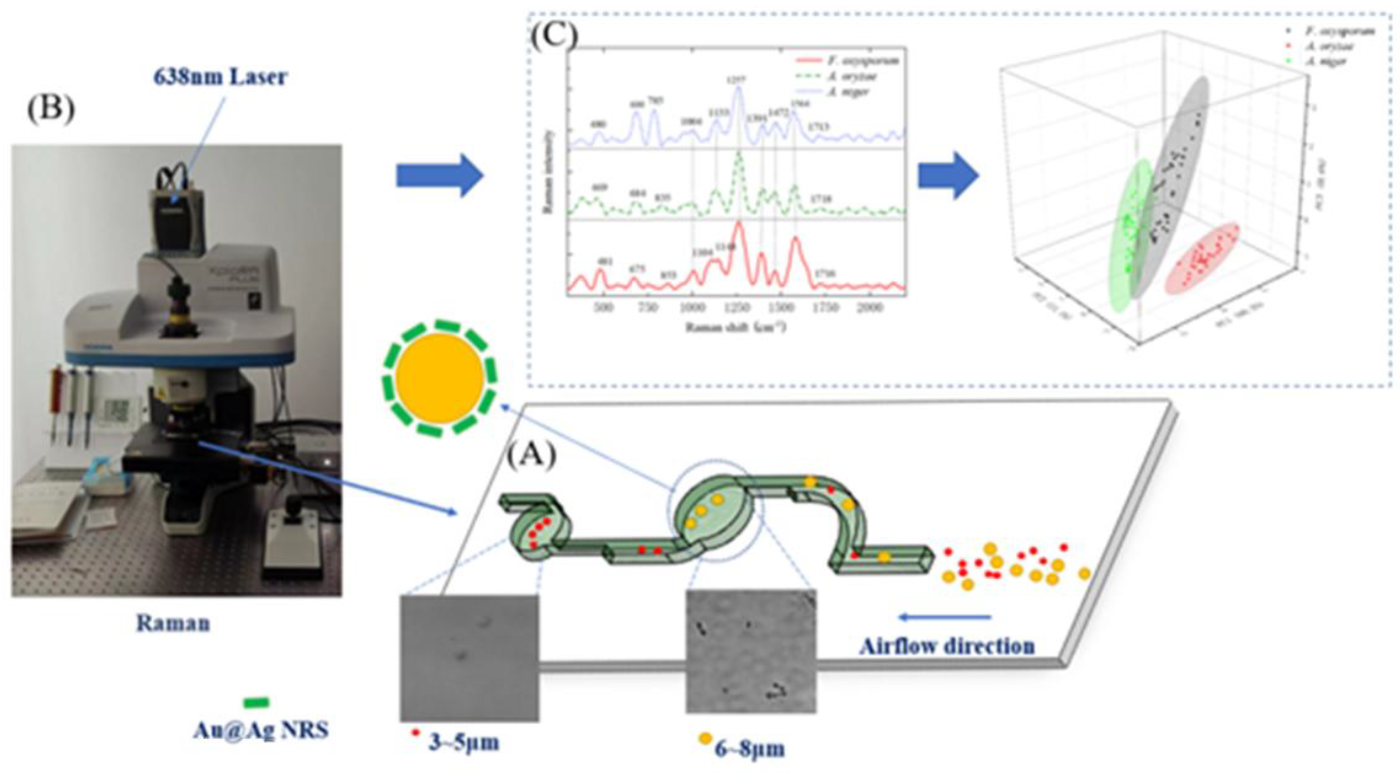 Traditional microscopic spore identification and counting primarily rely on manual observation. Due to the large quantity of captured spores, this method is labor-intensive, time-consuming, and inefficient. The accuracy of observation depends heavily on the operator’s expertise, often leading to significant errors [5,6,7]. In 2018, Lei et al. [8] employed a series of image processing techniques for automated detection and counting of rust spores, including a K-means clustering algorithm for image segmentation, identification based on shape factors and area, and rust spore contour segmentation via concavity analysis and contour segment merging. This algorithm demonstrated effective and accurate automated detection for rust spores, but image processing-based spore recognition is limited in the number of features it can incorporate. In 2021, Zhang et al. [9] proposed FSNet for fungal spore detection, enabling automatic identification and counting of fungal spores in microscopic images. However, methods based on images and deep learning remain insufficiently accurate for distinguishing spores with similar shapes and sizes. PCR is the gold standard method for microbial detection, frequently used for microbial identification with high accuracy. However, it requires professionals to lyse spores under stringent experimental conditions and involves cumbersome processing for fungal spore detection [10,11]. Existing microscopic image methods allow rapid detection and identification through morphology, but fail to accurately distinguish spores with similar shapes and sizes. PCR offers high accuracy but demands harsh detection conditions, destructive sampling, and suffers from poor timeliness and high costs. Therefore, there is an urgent need to develop a rapid and precise spore detection and identification technology. SERS technology, a light scattering technique, is low-cost and fast, capable of reflecting various vibrational frequencies and related energy levels of internal biological components. It can be used to identify the molecular composition and structure of biological samples and has been applied to bacterial identification and analysis [12,13]. However, direct detection using SERS spectra is challenging due to the low concentration of airborne spores and the presence of substantial impurities. Thus, a method for separation and enrichment is required to capture spores and enhance detection accuracy.