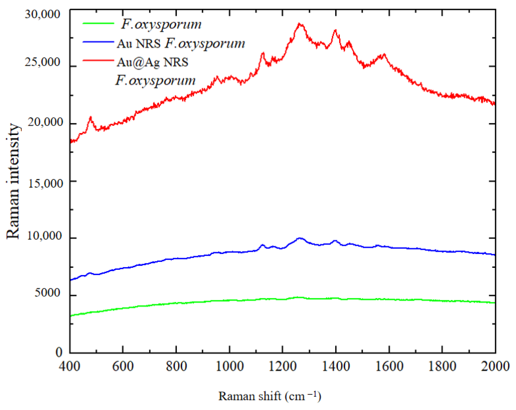 As observed in Figure 3, the raw Raman signals exhibit weak intensity with ill-defined spectral features. While Au NPs provide limited enhancement compared to the original spectra, Au@Ag NRS significantly amplifies the signals of Fusarium oxysporum spores. The SERS spectra of the three types of spores are shown in Figure 4.