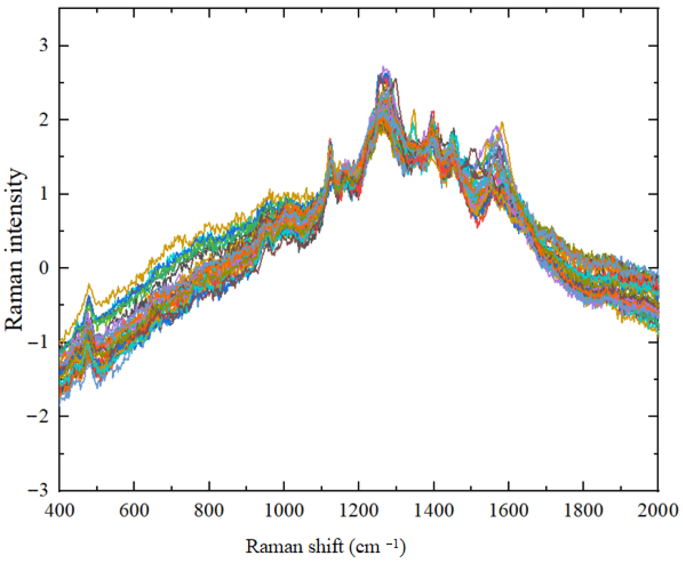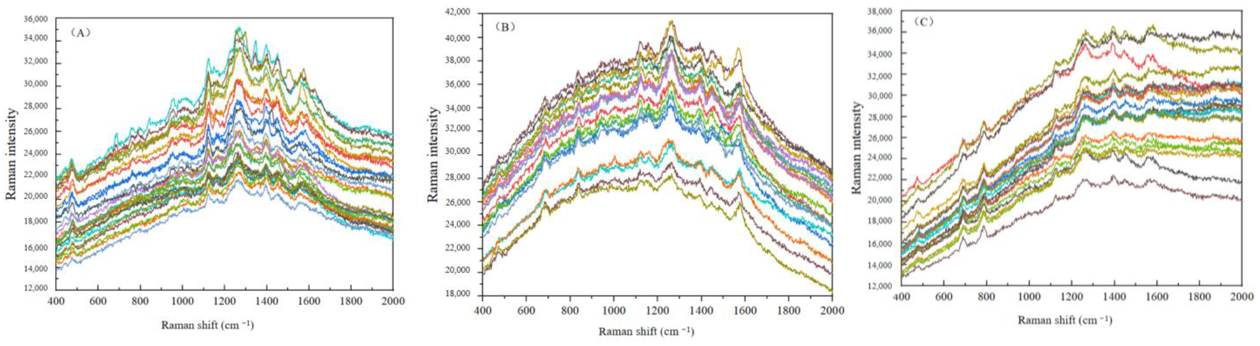 In this study, a total of 240 sets of SERS spectra were collected, comprising 80 sets for each of the three spore types. The SERS spectra acquisition was performed using an XploRA PLUS Raman spectrometer (HORIBA, Palaiseau, France) within the wave number shift range of 200–2000 cm−1. Prior to spectral acquisition, wave number calibration of the Raman spectrometer was conducted to ensure alignment between measured spectral data and true wave number values. For calibration, a silicon wafer was selected as the standard reference material, with its first-order Raman peak at 520.7 cm−1 [25]. The instrument was deemed calibrated when this peak was accurately detected at 520.7 cm−1. The Raman spectrometer parameters were configured as follows: excitation wavelength at 638 nm, objective magnification of 50×, laser power attenuation of 25%, integration time of 3 s, accumulation times of 3, spectral range of 200–2500 cm−1, and confocal aperture of 2 μm.