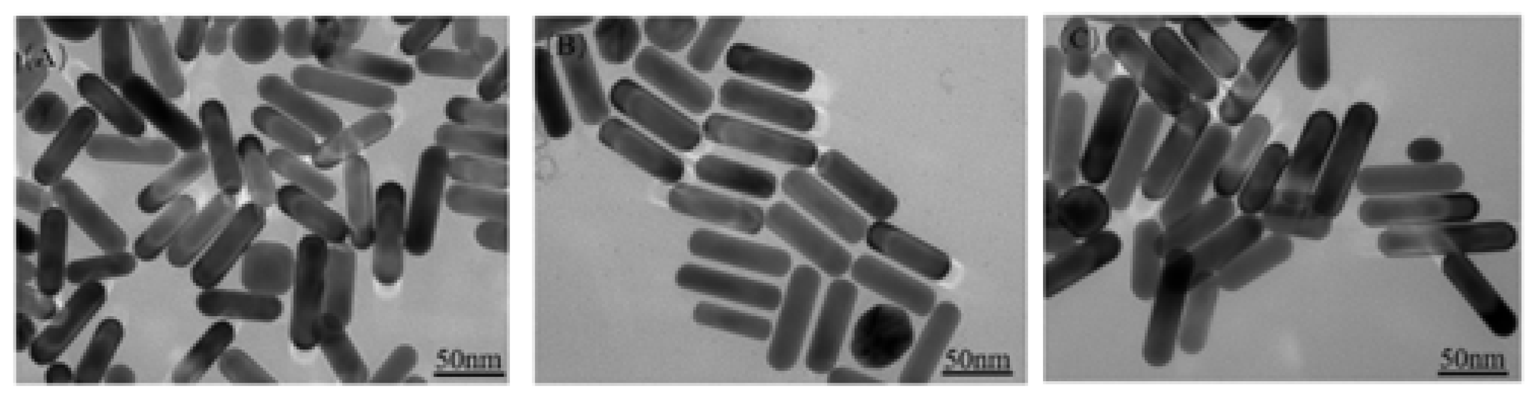 The equipment involved in this study included: (1) UV-Vis Spectrophotometer (UV-2600, Spectral bandwidth: 4 nm, Wavelength range: 200–1400 nm, Single beam, Shimadzu Corporation, Kyoto, Japan) for characterizing the optical properties of synthesized Au@Ag NRS. (2) High-Resolution Transmission Electron Microscope (HRTEM, JEM-2100 (HR), Point resolution: 0.23 nm, Line resolution: 0.14 nm, Magnification: 50~1,500,000×, JEOL Ltd., Kyoto, Japan) for nanoscale structural analysis. (3) Field-Emission Scanning Electron Microscope (FESEM, JSM-7800F, Resolution: 0.8 nm (at 15 kV), 1.2 nm (at 1 kV), Magnification: 25 ~ 1,000,000×, JEOL Ltd., Kyoto, Japan) for surface morphology characterization.