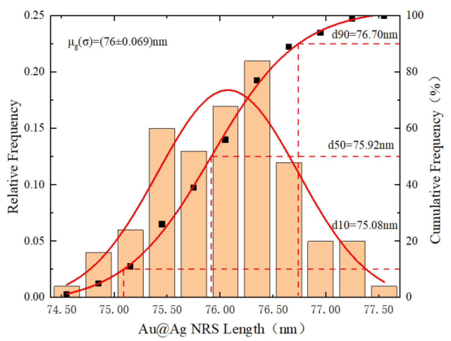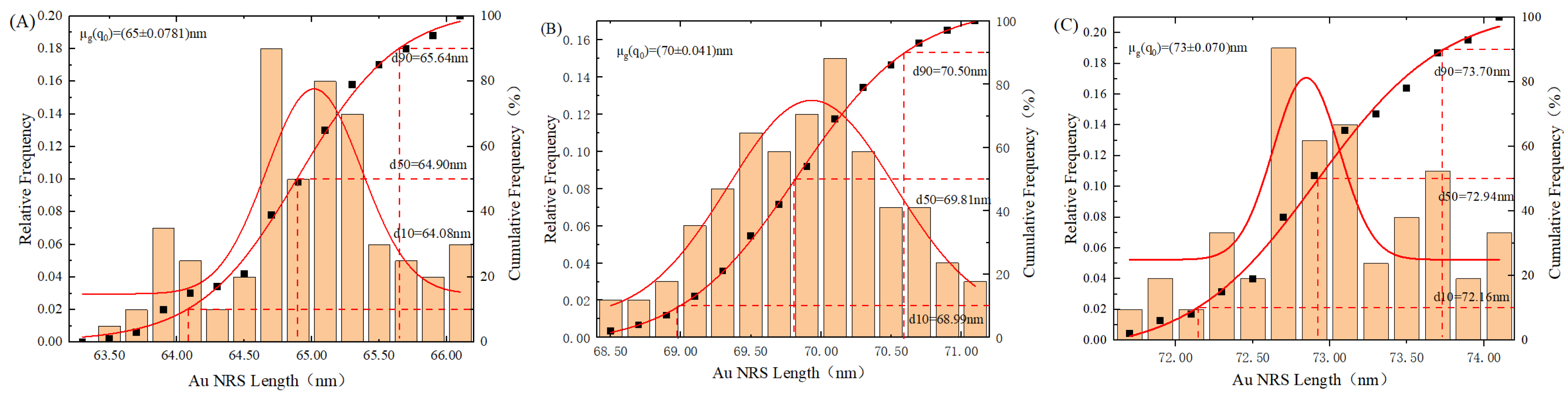 As shown in the particle size distribution histograms for Groups 1–3 in Figure 7, the relative frequency and cumulative frequency were fitted using LogNormal and Boltzmann functions, respectively. The histograms statistically analyzed the relative frequency of particle sizes and the dimensions corresponding to cumulative frequencies of 10%, 50%, and 90% (d10, d50, d90). Nonlinear fitting yielded the geometric mean (μg) and standard deviation (σ): Group 1 exhibited d10 = 64.08 nm, d50 = 64.90 nm, d90 = 65.64 nm, μg = 65 nm, σ = 0.0781; Group 2 showed d10 = 68.99 nm, d50 = 69.81 nm, d90 = 70.50 nm, μg = 70 nm, σ = 0.0410; Group 3 displayed d10 = 72.16 nm, d50 = 72.94 nm, d90 = 73.70 nm, μg = 73 nm, σ = 0.0700. Therefore, the synthesized Au NRS demonstrated uniformity meeting experimental requirements, and Group 2 particles with a geometric mean length of 70 nm were selected for further synthesis.