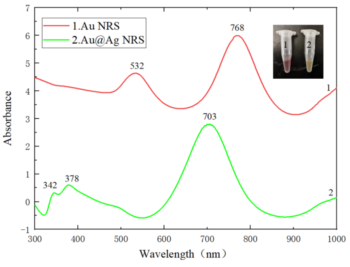 As shown in Figure 8, the UV-vis-NIR absorption spectrum of the synthesized Au@Ag NRS was compared with that of Au NRS. The spectrum exhibited a blue shift of the characteristic peak and the emergence of an additional peak. The UV-vis-NIR absorption spectrum of Au@Ag NRS displayed three distinct peaks at 703 nm, 378 nm, and 342 nm. The peak at 703 nm arises from the transverse surface plasmon resonance (TSPR) of the nanorods, while the peak at 342 nm originates from their longitudinal surface plasmon resonance (LSPR) [30]. The peak at 378 nm is attributed to the localized surface plasmon resonance (LSPR) of the silver nanoshell [31].