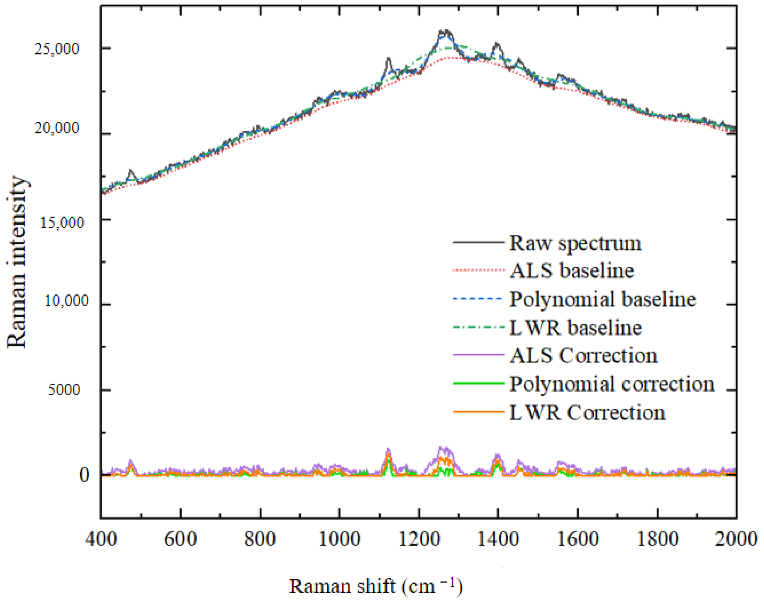 Asymmetric Least Squares (ALS), Polynomial Fitting Baseline Correction, and Locally Weighted Regression (LWR) were selected for baseline correction in this study, with the correction results shown in Figure 17.