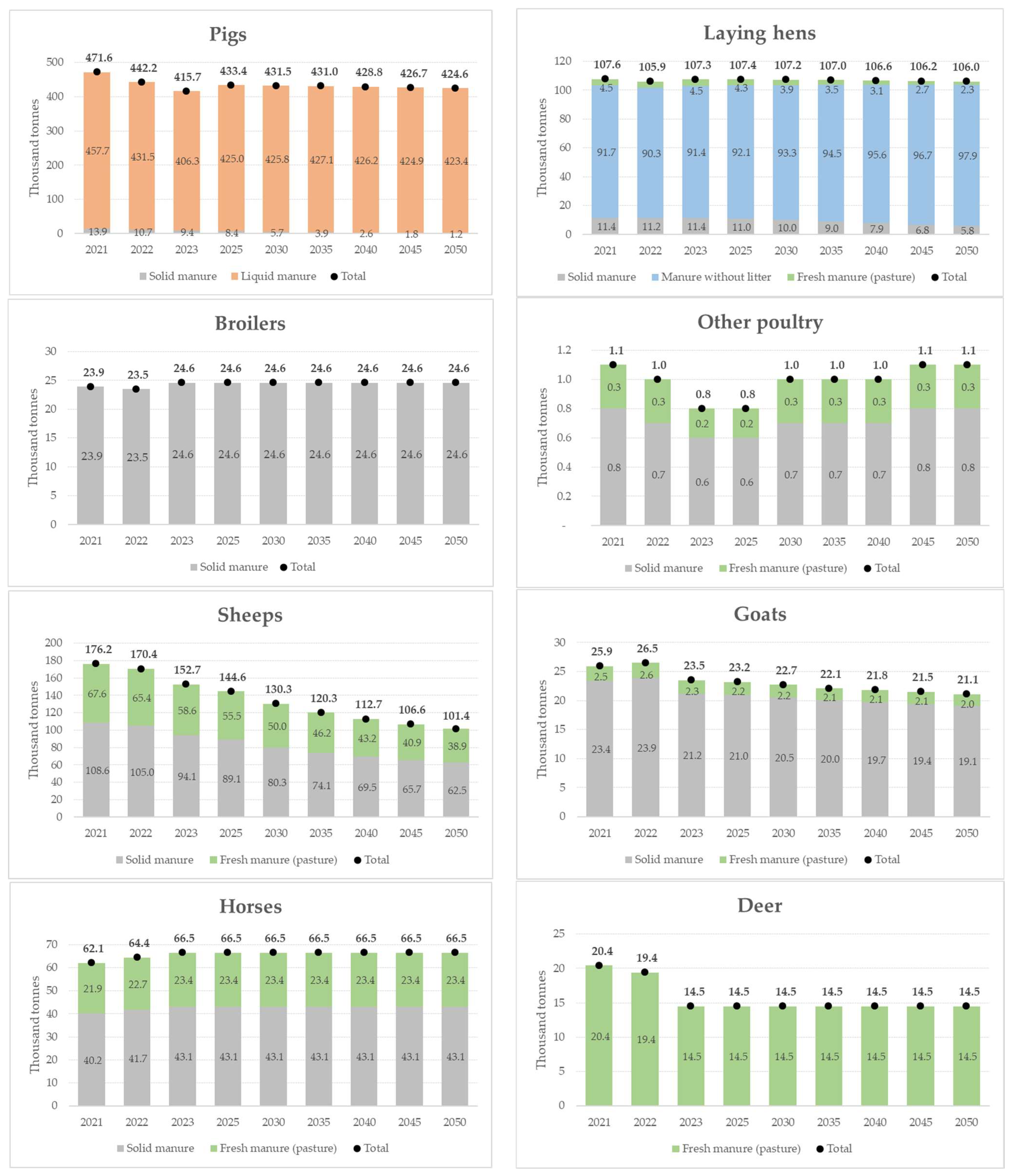 3.1. Manure Production and Its Projection up to 2050 in Latvia