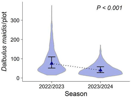 The total number of leafhoppers collected during the 2022/2023 season (65,711) was nearly double that collected during the 2023/2024 season (33,781), indicating a substantial difference in D. maidis pressure between the two years. As shown in Table 1 and Figure 1, D. maidis abundance differed significantly between the two seasons, with distinct temporal patterns (Figure 2).