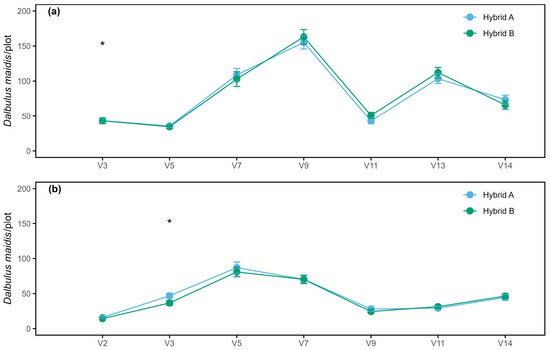 Specifically, in the 2022/2023 season (Figure 2a), a peak in leafhopper abundance was observed at the V9 growth stage, following relatively low populations during the early vegetative stages. A secondary peak occurred at V13, and the overall abundance was higher compared to the second season. In contrast, the 2023/2024 season (Figure 2b) exhibited a peak at V5, with a more gradual population increase during the early vegetative stages and a lower overall abundance.