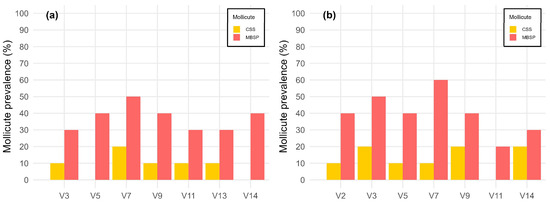 The analytical detection of mollicutes in leafhoppers, determined by PCR analysis, is presented in Figure 3. Across both seasons, the prevalence of MBSP in leafhoppers was consistently higher than that of CSS. The peak prevalence of MBSP occurred in leafhopper samples collected at the V7 growth stage in both seasons, reaching 50% in 2022/2023 and 60% in 2023/2024.
