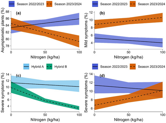 Predicted percentage of asymptomatic plants by season (a), plants exhibiting mild symptoms by season (b), plants exhibiting severe symptoms by corn hybrids (c), and plants exhibiting severe symptoms by season (d) at the R1 stage as a function of nitrogen rate (kg ha−1). Shaded areas represent 95% confidence intervals for the predictions.