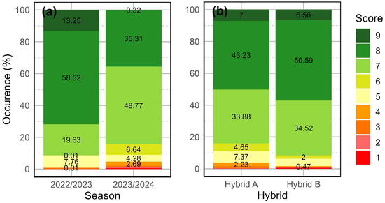 When isolating the effect of corn hybrids across seasons, Hybrid B exhibited a higher percentage of plants with vigor scores of seven or higher (91.7%) compared to the Hybrid A (84.1%), a difference of 7.6 percentage points (Figure 5b).