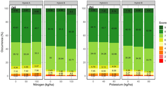 Frequency of vigor scores (symptoms) used to assess the response of two corn hybrids to corn stunt complex pathogens under varying top-dressed nitrogen (a) and potassium (b) rates.