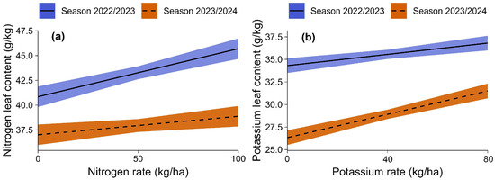 Predicted foliar nitrogen (a) and potassium (b) concentrations in corn leaf samples as a function of top-dressed nutrient rate (kg ha−1) across two seasons. Shaded areas represent 95% confidence intervals for the predictions.