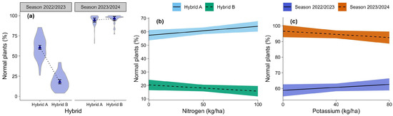 The percentage of normal plants at harvest was significantly influenced by the interactions between season and hybrid, hybrid and N rate, and season and K rate (Table S4). The 2022/2023 season exhibited a lower percentage of normal plants, with Hybrid A showing a greater percentage compared to Hybrid B (Figure 8a). Across all top-dressed N rates, Hybrid B had a lower percentage of intact plants compared to Hybrid A (Figure 8b). The hybrids also responded differently to increasing N rates: Hybrid A showed an increase in normal plants at higher N rates, while Hybrid B exhibited a reduction. The effect of increasing K rates on plant integrity also differed between seasons. In 2022/2023, higher K rates increased the number of normal plants, whereas in the second experiment, plots receiving top-dressed K showed a reduction (Figure 8c).