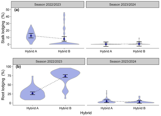 The percentage of broken plants was higher in the 2022/2023 season, and in this season, Hybrid A had more stalk-lodged plants compared to Hybrid B (Figure 9a). A similar trend was observed for the percentage of root-lodged plants, but in this case, Hybrid B had a higher number of root-lodged plants in the 2022/2023 season (Figure 9b).