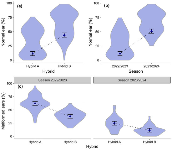 Distribution and predicted percentage of normal ears in two corn hybrids (a) and normal ears across two seasons (b), and percentage of malformed ears in two corn hybrids across two seasons (c). Shaded areas represent the distribution of observed data, while points and lines depict predicted values and their confidence intervals.