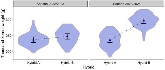Distribution and predicted thousand-kernel weight (g) in two corn hybrids across two seasons. Shaded areas represent the distribution of observed data, while points and lines depict predicted values and their confidence intervals.