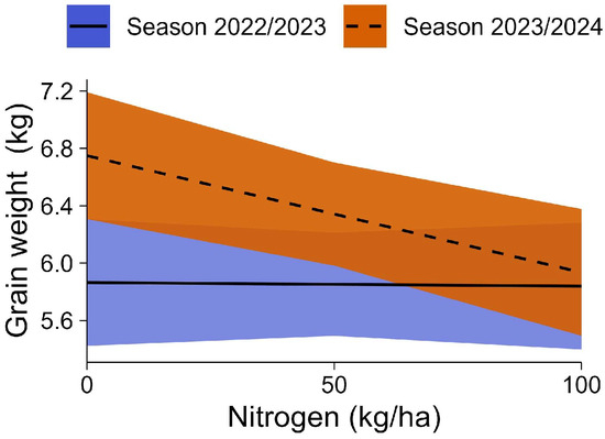 Predicted harvested corn grain weight per plot (kg) as a function of nitrogen application rate (kg ha−1) across two seasons. Shaded areas represent 95% confidence intervals for the predictions.