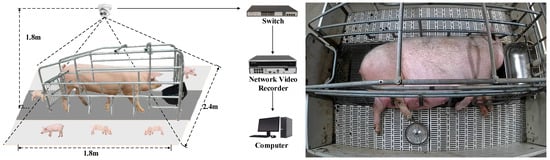 The experimental dataset was collected in April 2025 at the Nanshang Nongke Pig Farm in Nanyang City, Henan Province. The sows were of the Large White breed. Ten farrowing pens, each measuring 2.4 m × 1.8 m, were selected as experimental sites. Each pen housed one sow and a variable number of newborn piglets, ranging from 7 to 14, and was fitted with plastic slatted flooring and iron guardrails. The farrowing house was maintained at a temperature of 24–30 °C. Heat lamps were installed in the piglet activity areas, while natural daylight provided overall illumination. A hemispherical camera (DS-2CD3326WDV3-I, Hikvision, Hangzhou, China) was mounted 1.8 m above the center of each pen to capture the entire piglet activity area. The cameras were connected via Ethernet to a switch (DS-3E0526P-E, Hikvision, China) and powered using Power over Ethernet (POE). Video streams were stored on a network video recorder (DS-7932N-R4, Hikvision, China) at 25 fps and a resolution of 1920 × 1080 pixels. Recordings covered the period from the onset of farrowing to 30 min after delivery, ensuring capture of the critical neonatal activity phase. A schematic diagram and a representative image of the farrowing pen setup are shown in Figure 1.