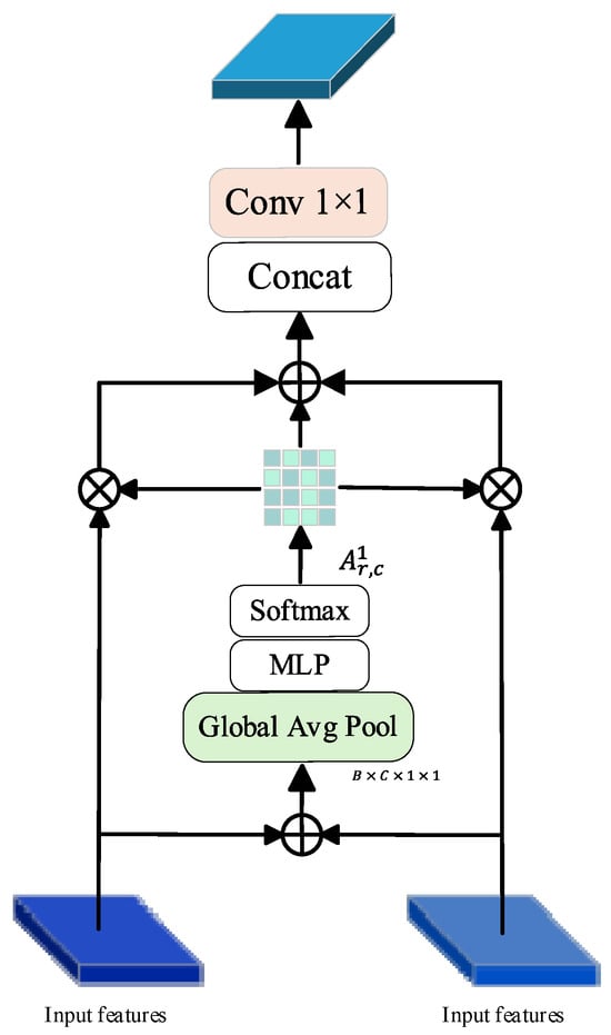 Here, the channel-reduction ratio is controlled by the hyperparameter . The weight tensor represents the fusion importance of each branch across different channels, with the Softmax function applied to ensure normalization and interpretability. Finally, the MFM module integrates multi-scale semantics through branch-wise weighted summation, as expressed in Equation (8).