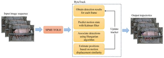 This study integrates the high-performance multi-object tracker ByteTrack [26] with the outputs of the SPMF-YOLO detector to achieve frame-by-frame tracking of each piglet. As an advanced tracking algorithm, ByteTrack enhances robustness in pig behavior monitoring through its unique frame-processing mechanism: First, it applies a confidence threshold to divide detected boxes into high- and low-confidence sets. High-confidence boxes are used for Kalman filter–based trajectory prediction and historical ID matching to maintain pig identity continuity, whereas low-confidence boxes are secondarily matched with unassociated trajectories to account for reappearance after brief occlusions. Unmatched high-confidence boxes initiate new trajectories, while unmatched trajectories are retained for a fixed number of frames to accommodate potential reappearance after occlusion. At its core, ByteTrack leverages the Hungarian algorithm to efficiently solve optimal matching problems in complex scenarios, in combination with Kalman filtering to accurately predict pig movement states. The proposed design facilitates ID recovery following occlusion and markedly boosts tracking robustness and precision in large-scale livestock farming scenarios. Figure 5 depicts the operational principle of ByteTrack.