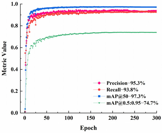 For a thorough assessment of the proposed detection model, precision (P), recall (R), mAP@0.5, and mAP@0.5:0.95 are employed as evaluation criteria, with their definitions provided in Equations (10)–(13).
