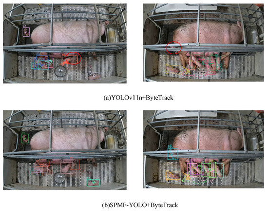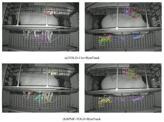 Figure 8 compares the performance of the baseline model and the improved model under low-light conditions in a two-pen environment. As shown in Figure 8a, insufficient illumination causes occlusions between piglets and the sow, leading to detection and tracking difficulties. This results in missed detections and target loss, with these errors highlighted by red boxes. In scenarios where multiple piglets heavily overlap around the sow, both the baseline YOLOv11n + ByteTrack and the proposed SPMF-YOLO + ByteTrack exhibit identity switching and occasional missed detections. However, the baseline model also suffers from severe ID switching, while the improved model, despite some errors under challenging conditions, generally maintains better trajectory continuity. Overall, compared with the baseline, the proposed method still demonstrates superior tracking robustness under complex low-light and occlusion conditions.