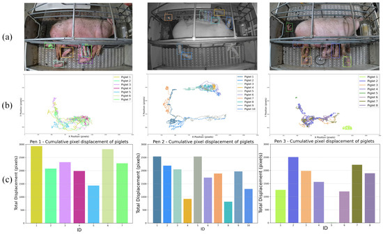 Schematic Diagram Quantifying the Movement Trajectories and Activity Levels of Newborn Piglets. (a) Position representing newborn piglets; (b) Trajectory representing newborn piglets; (c) Total displacement representing newborn piglets.