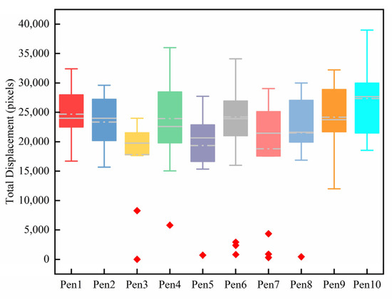 Building upon sample validation, this study further tracked and quantified the movement trajectories of newborn piglets across ten pens during the first 30 min after birth. Unlike previous methods that relied solely on group-level statistics, this study obtained cumulative displacement data at the individual level, ensuring that the movement activity of each piglet during the critical postnatal period was comprehensively captured and analyzed. This individualized tracking approach enables more sensitive detection of activity-distribution variations within pens, thereby supporting the early identification of abnormal individuals. It should be noted that outliers in the box plots indicate deviations from the statistical distribution but do not constitute definitive criteria for health-status classification.