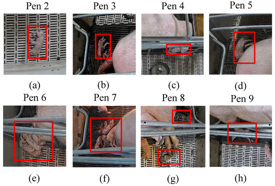 Illustration of Abnormal Piglets. (a) Pen 2: A piglet requiring manual assistance for suckling.; (b) Pen 3: An individual with rapid decline in vitality and lack of normal locomotor behavior; (c) Pen 4: A piglet misclassified as abnormal due to temporary restriction by the confinement pen; (d–g) Pens 5, 6, 7, and 8: Multiple abnormal piglets showing marked lethargy after birth, progressively losing effective locomotion and suckling behavior, with typical signs of limb weakness or rigid posture; (h) Pen 9: A piglet with interrupted movement trajectory caused by trampling by the sow.