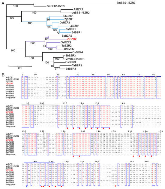 Phylogenetic analysis and multiple sequence alignments of ZjBZR2. (A). Phylogenetic tree analysis of ZjBZR2 and BZR proteins in Arabidopsis thaliana, Oryza sativa, Zea mays, Sorghum bicolor, Brachypodium distachyon, Triticum aestivum, and Lolium perenne. The branches containing ZjBZR2 and ZjBZR1 were indicated by blue and purple lines, respectively, and the ZjBZR2 label was highlighted in red. (B). Sequence alignment of ZjBZR2 with BZR transcription factors in other plant species. The black lines mark the N-terminal DNA-binding domain. The blue arrow and blue line highlight the bzr1-1D and bes1-D mutations and the putative PEST sequence. The red star marks the putative glycogen synthase kinase 3 (GSK3) -like kinase phosphorylation sites (S/TXXXS/T).