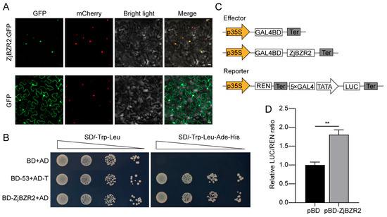 Subcellular localization and transactivation activity of ZjBZR2. (A). Subcellular localization of ZjBZR2. The full length CDS of ZjBZR2 was cloned and fused to GFP for localization analysis. mCherry was used as a nuclear marker. Scale bar = 20 μm. (B). Transcriptional activity of ZjBZR2 protein in yeast. (C). Diagram of vector construction for detecting self-activation ability of ZjBZR2. (D). Transactivation activity of ZjBZR2 in Nicotiana benthamiana. Data are displayed by means ± SE of three biological replicates. Student’s t-test was used to compare the difference. ** p < 0.01.