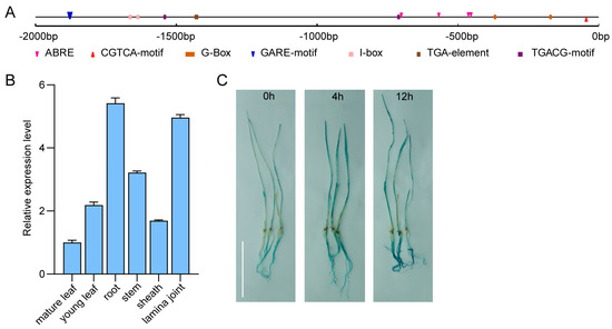Predicted cis-acting elements included the following: ABRE, CGTCA/TGACG-motif, GARE-motif, TGA-element, and light-responsive elements (I-box/G-box) (Figure 3A). These cis-acting elements were associated with light regulation and hormone signaling, such as abscisic acid (ABA), methyl jasmonate (MeJA), gibberellins (GA), and auxin.
