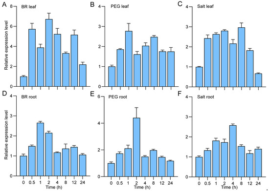 To analyze ZjBZR2 expression under BR, PEG, and salt treatments in Z. japonica, seedlings were sprayed with 1 µM 2, 4-epibrassinolide (EBL) and treated with a solution of 20% PEG 6000 (w/v) or 200 mM NaCl, respectively [15,25]. Leaf and root samples were collected at 0, 0.5, 1, 2, 4, 8, 12, and 24 h, respectively. Samples from the root, stem, and leaf of Z. japonica seedlings were collected for the analysis of ZjBZR2 expression pattern. All the samples were frozen in liquid nitrogen and stored at −80 °C for further measurements.