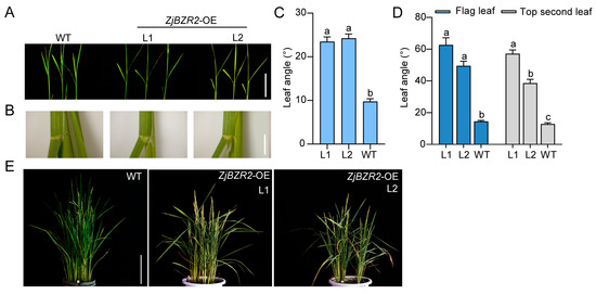 The phenotypes of plants at seedling and heading stages. (A). The phenotype of the leaf angle of two-week-old WT and ZjBZR2-OE lines at seedling stage. Scale bar = 5 cm. (B). Stereomicroscopic images of the second leaf angle in two-week-old WT and ZjBZR2-OE lines. Scale bar = 5 mm. (C). The leaf angle at the second leaf in two-week-old WT and ZjBZR2-OE lines at seedling stage. (D). The leaf angle at the second leaf and flag leaf of two-week-old WT and ZjBZR2-OE lines at heading stage. (E). The phenotype of the leaf angle of WT and ZjBZR2-OE lines at heading stage. Scale bar = 20 cm. Data are displayed by means ± SE (n ≥ 15). One-way ANOVA was conducted and significant differences (p < 0.05) are shown by different letters.
