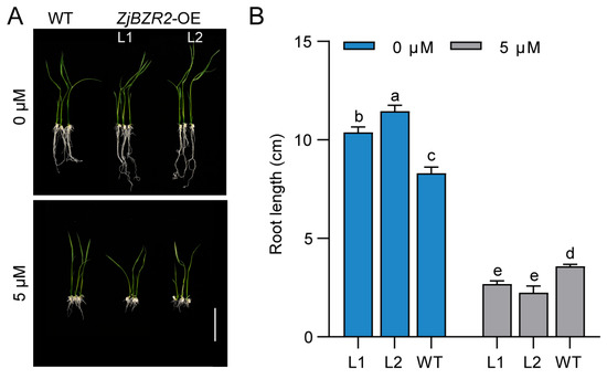 To further elucidate the role of ZjBZR2 in the BR signaling pathway, BR sensitivity was analyzed in WT and ZjBZR2 transgenic seedlings. ZjBZR2-OE seedlings displayed different BR sensitivity, as shown by differential root growth in response to BR treatment (Figure 6). In the absence of BR, the root length of ZjBZR2-OE seedlings was significantly longer than that of WT seedlings. However, in the presence of BR, ZjBZR2-OE seedlings exhibited shorter root length compared to WT (Figure 6B).