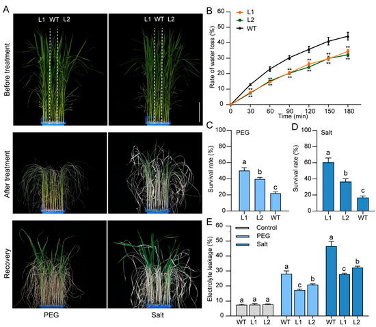 Electrolyte leakage was examined in accordance with the methods described by the authors of [31]. The leaves of WT and transgenic seedlings were collected before treatments and 3 d after PEG/salt treatments, respectively. Samples were immersed in 30 mL of deionized water for 12 h, followed by measuring the initial solution conductivity (C1). After boiling the leaves for 15 min and cooling them completely to room temperature, the final conductivity (C2) was measured. Electrolyte leakage was calculated as the ratio of C1/C2 × 100.