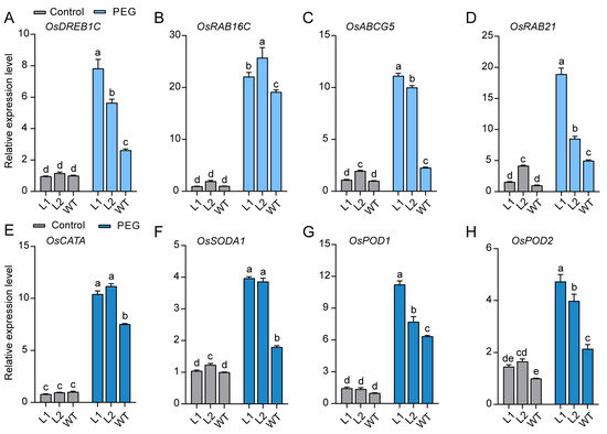 The expression of stress-responsive and ROS-scavenging genes in WT and ZjBZR2-OE seedlings after 3 d of PEG treatments. (A). OsDREB1C, (B). OsRAB16C, (C). OsABCG5, (D). OsRAB21, (E). OsCATA, (F). OsSODA1, (G). OsPOD1, (H). OsPOD2. Data are displayed by means ± SE of three biological replicates. One-way ANOVA was conducted and significant differences (p < 0.05) are shown by different letters.