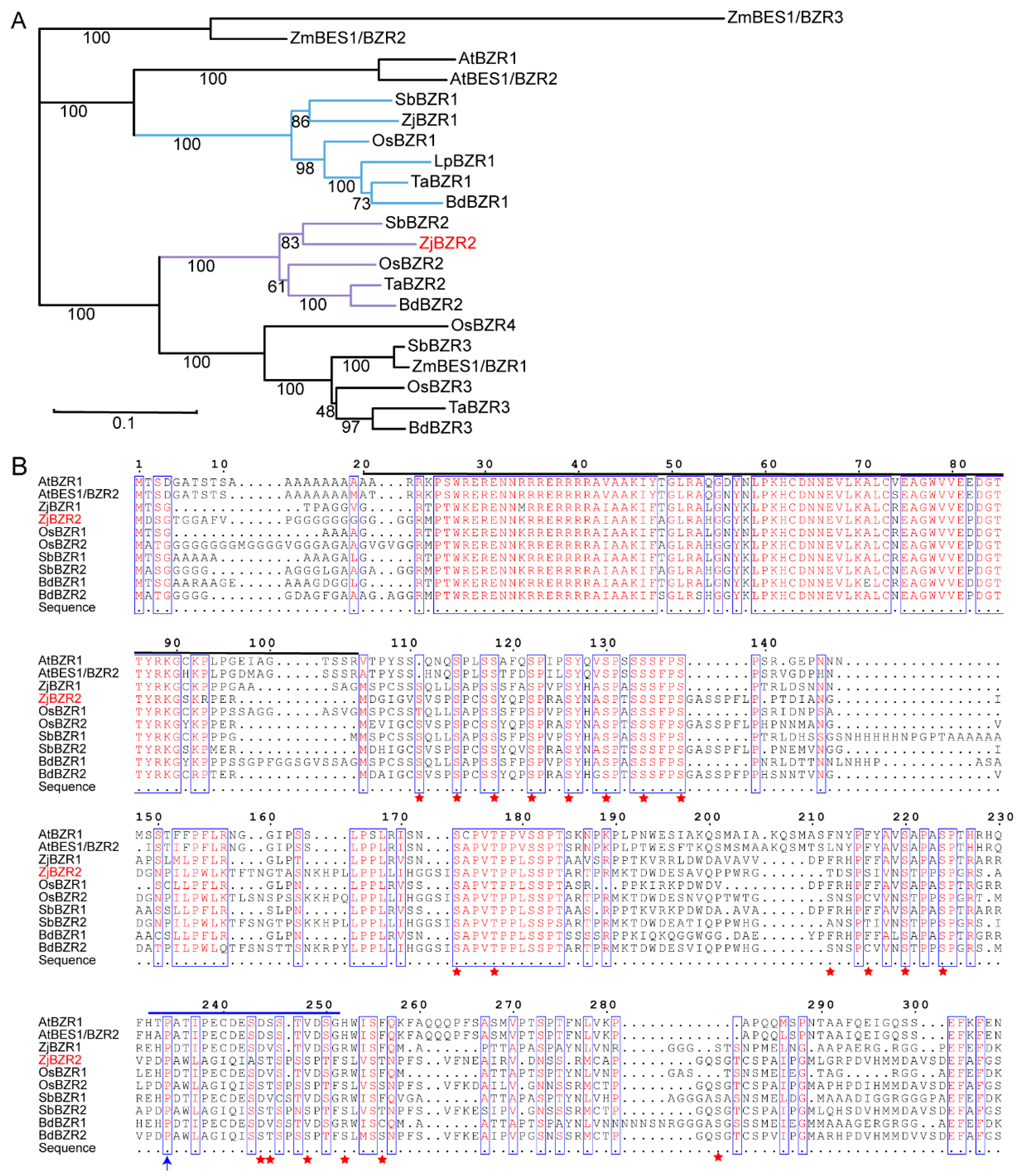 3.1. Identification of ZjBZR2 in Zoysia japonica