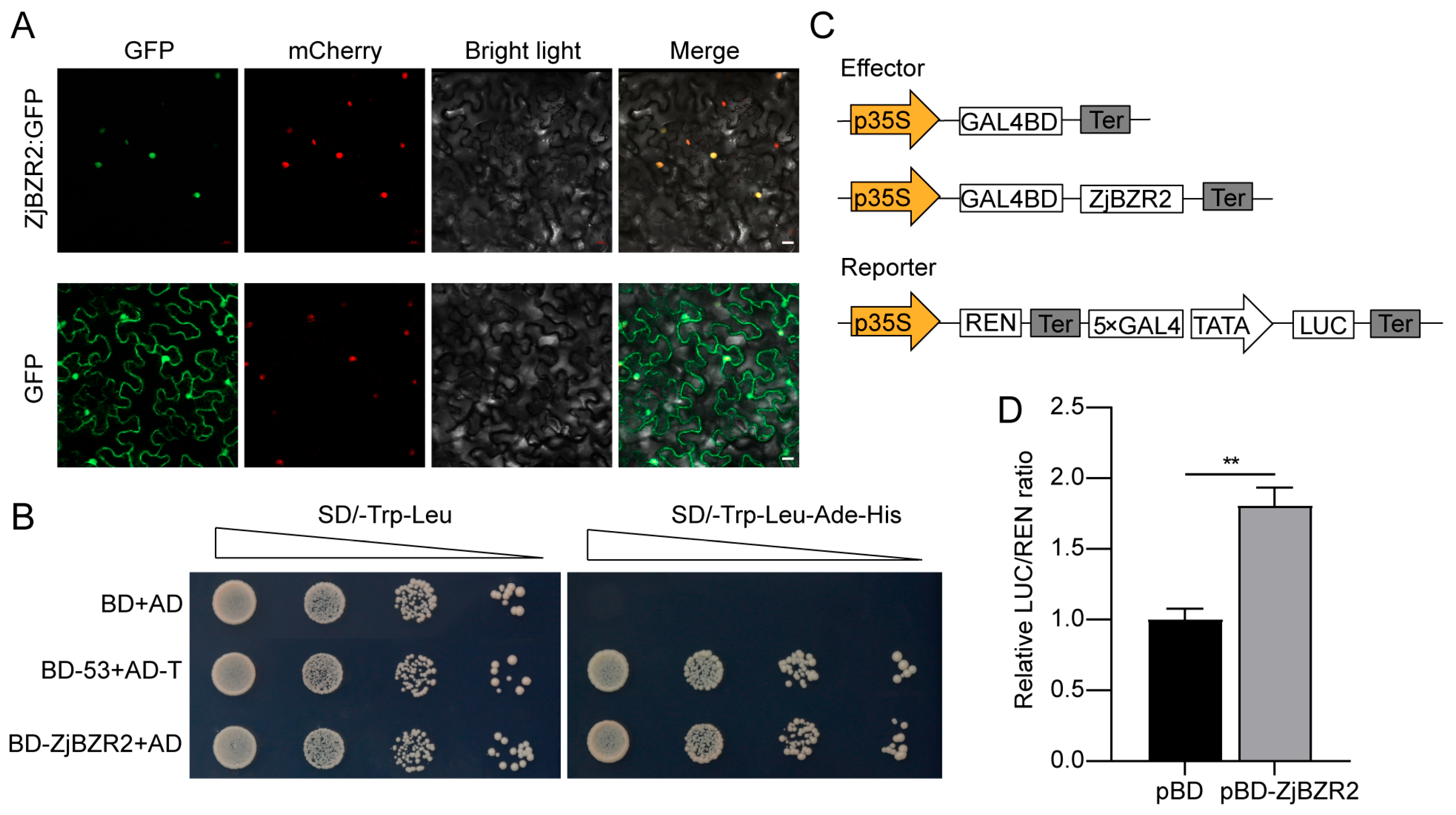 3.2. Subcellular Localization and Transcriptional Activity of ZjBZR2