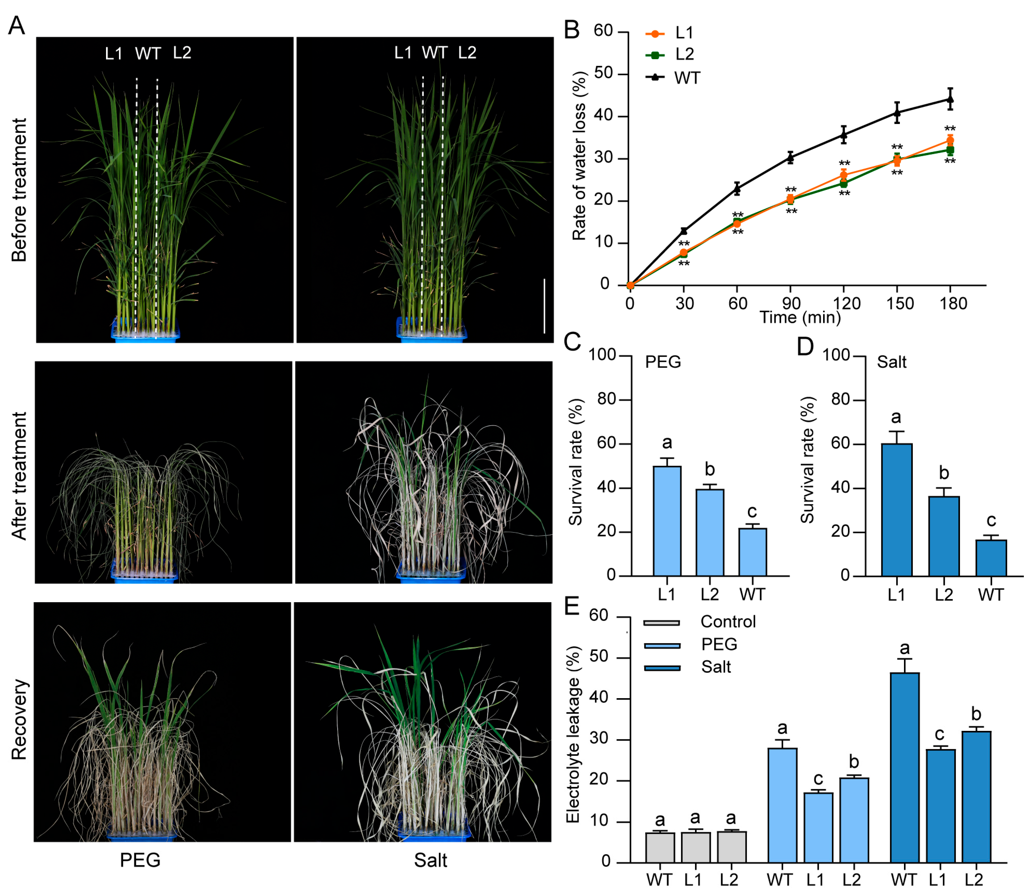 3.6. Overexpression of ZjBZR2 Enhanced Osmotic Stress Tolerance in Rice