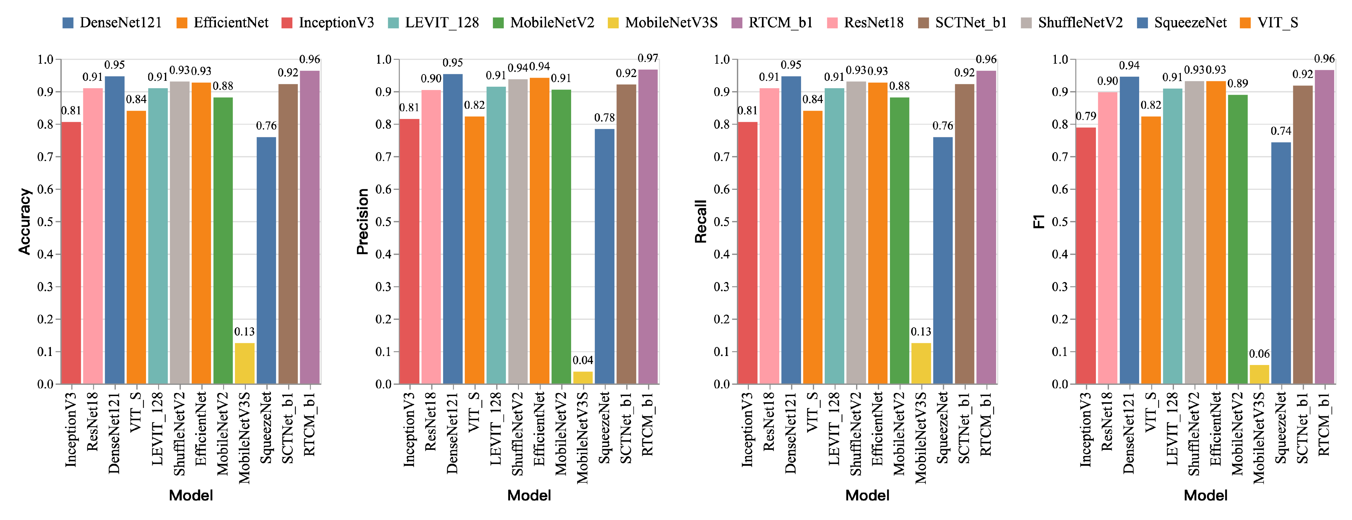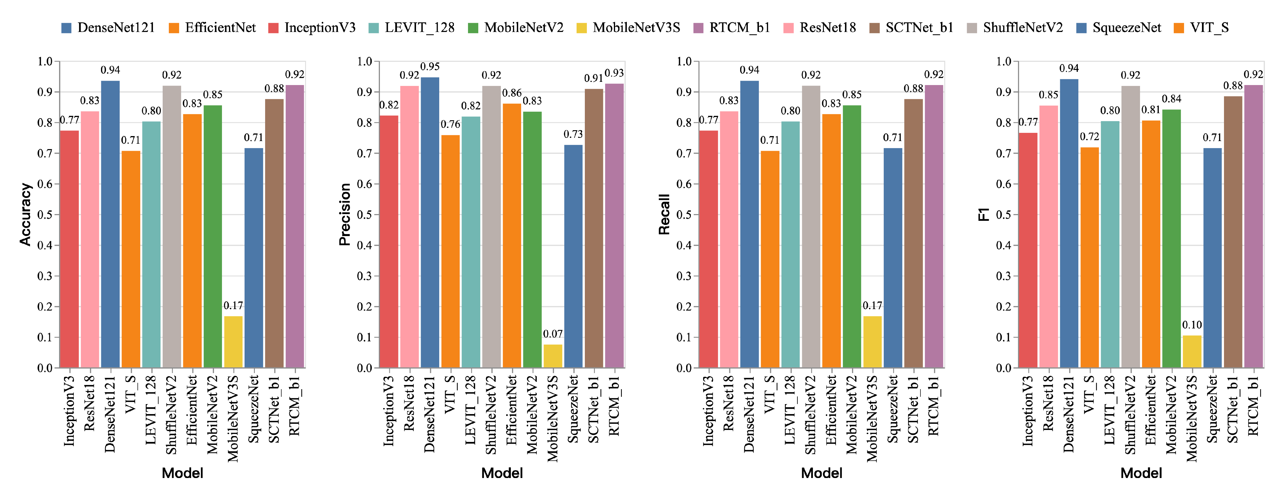 - Performance—Extensive experiments demonstrate that RTCMNet exceeds the accuracy of DenseNet121 while requiring only 0.35 M parameters and achieving an inference time of 33 ms on mobile hardware.