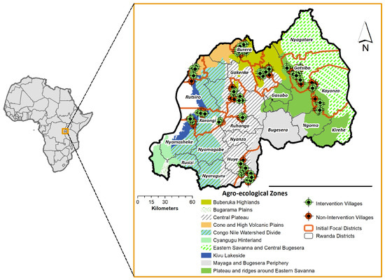 The digital innovation was implemented in Rwanda, a country with a population of 14 million people, out of which approximately 76% are smallholder farmers [24]. Generally, 99% of the farmers cultivate banana at different scales and for different purposes, ranging from homestead cultivation for household consumption to larger farmlands for commercial production, while the typical farmland size per household is 0.5 ha [25]. Banana is often cultivated under a mixed cropping system alongside other crops such as maize, cassava, sweet potatoes, cowpea, and others. The implementation initially focused on eight (8) major banana-producing districts (Figure 1), during the first three years (pilot stage), while the rest of the districts in Rwanda were later included during the final three years (scaling stage). Also, for the pilot stage, 138 villages were selected through a stratified random sampling technique, and these were randomly split (50:50 ratio) into intervention and non-intervention (control) villages to assess the impact of the digital tool deployment. In the intervention villages, selected farmers and farmer promoters were engaged in the development, testing, and scaling of the digital innovation tools, whereas there was no direct effort to reach or engage with those in the non-intervention villages. However, beyond our control, we acknowledge that some knowledge exchange and diffusion of information may have passively occurred between the intervention and control villages.